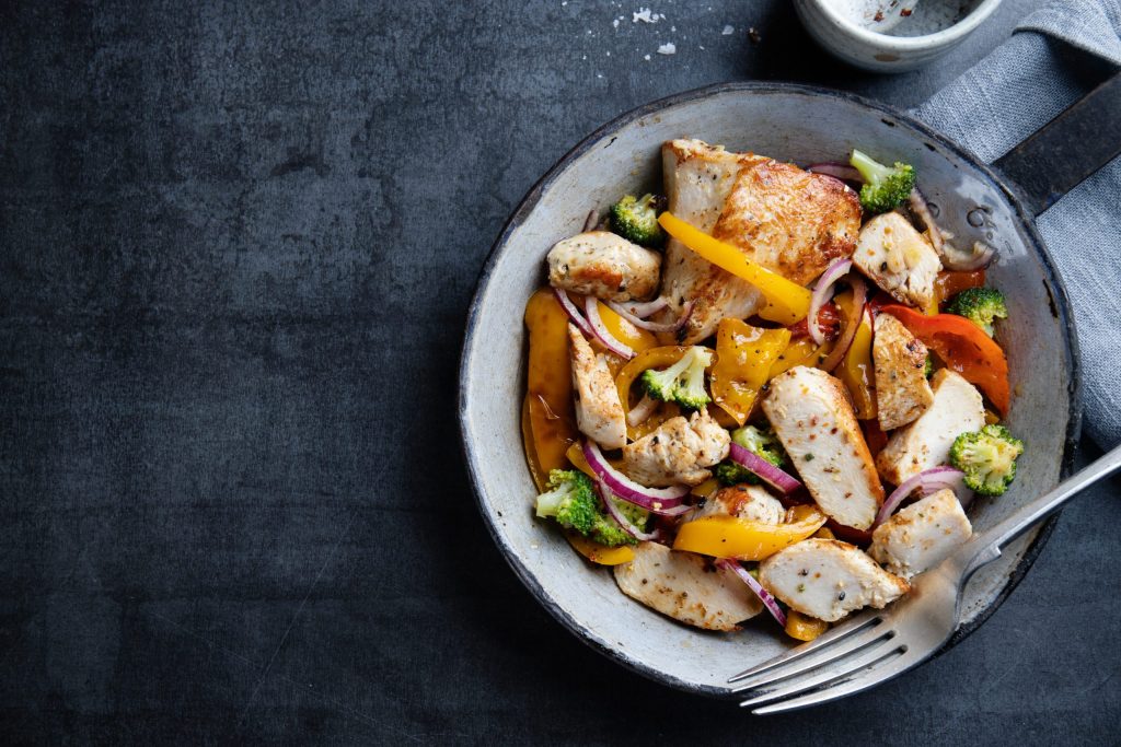 Chicken and vegetables fried or stuffed served on pan on bright background.