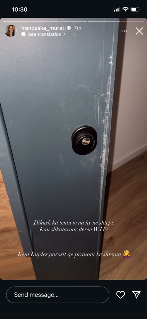 Franceska Murati, ish-banore e “Big Brother”, ka ndarë së fundmi një postim në “Instagram Story”, ku tregon se persona të paidentifikuar kanë tentuar të hyjnë në banesën e saj.