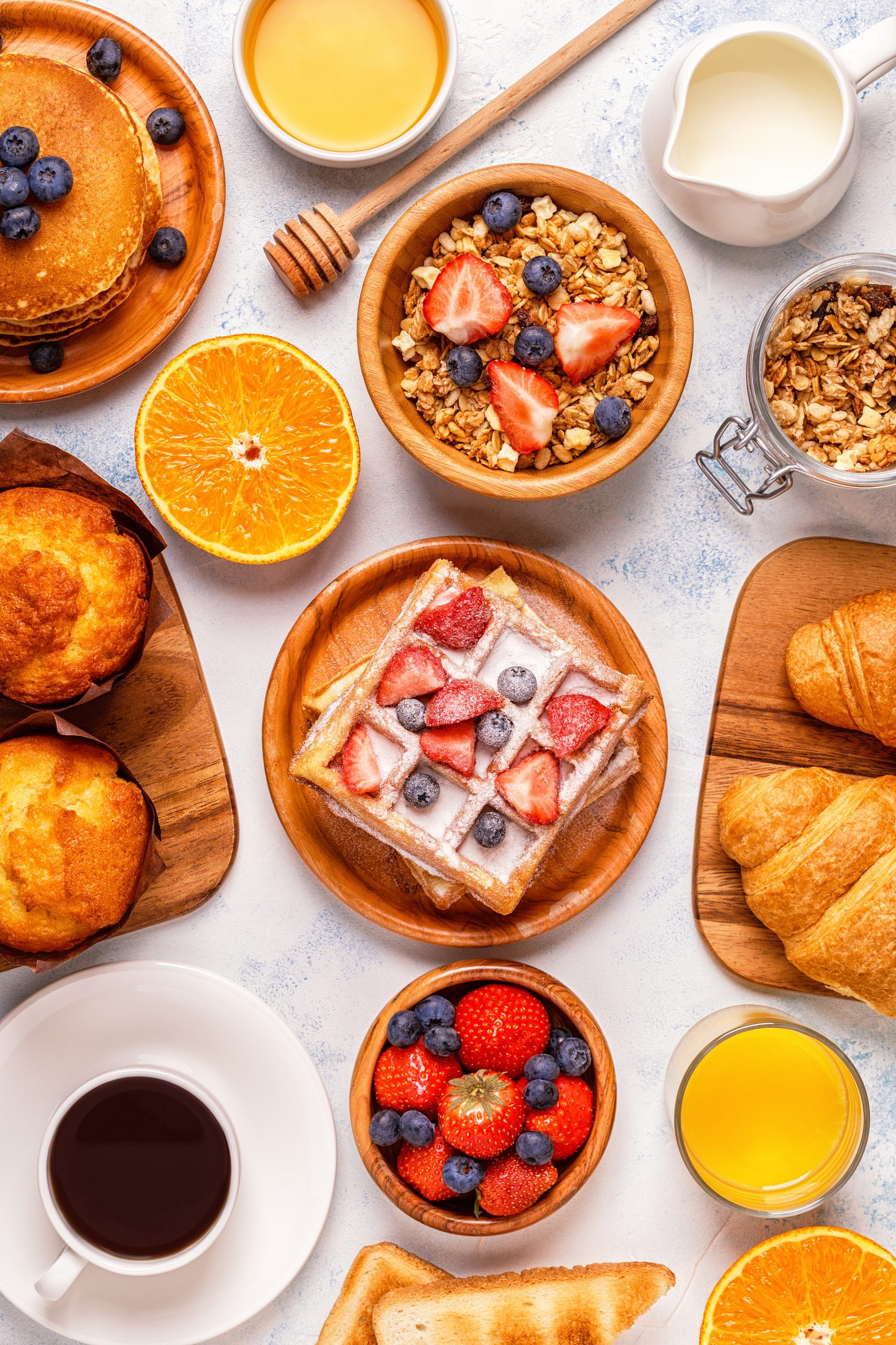 Delicious breakfast on a light table. Top view, copy space.